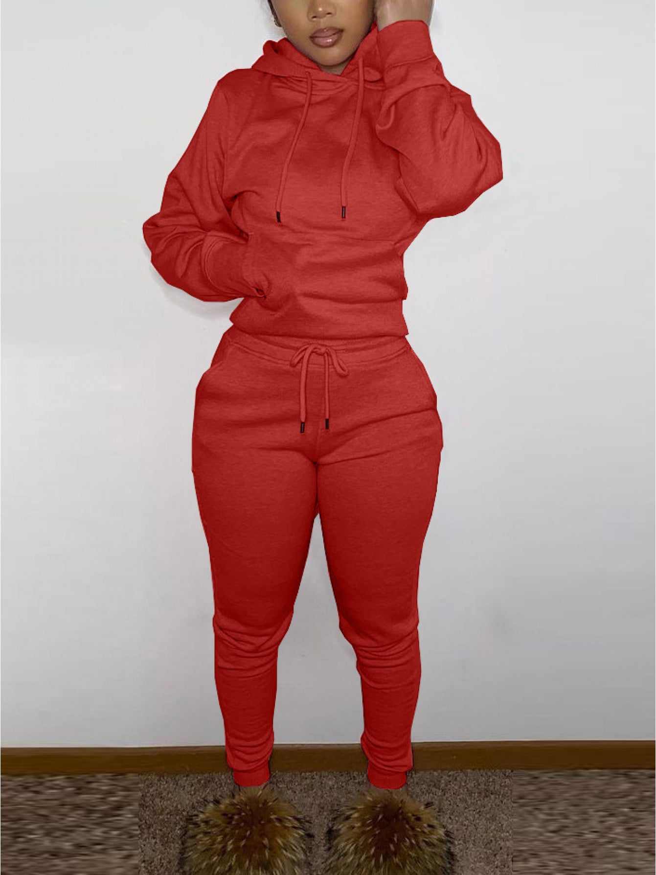 Pair the fleece-lined hoodie with leggings or joggers for a complete athleisure look, or layer over a shell for outdoor activities. The solid color and sleek silhouette make it a go-to piece for gym days, outdoor runs, or cozy lounge evenings.