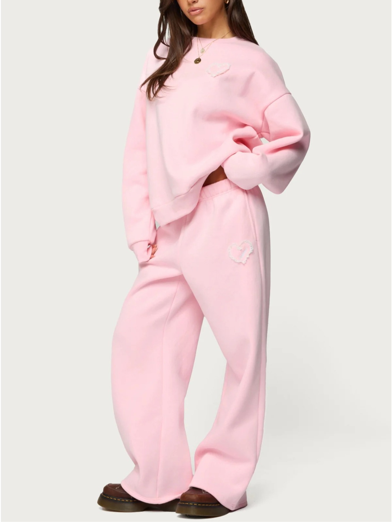 Pink Heart-Print Hoodie + Wide-Leg Pants Set for Women | Sweet Heart Embellishments, Perfect for Everyday Outings and Girly Social Occasions